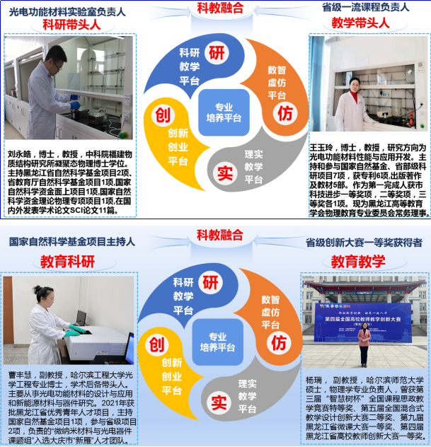 弘扬教育家精神,做教书育人模范,教学上构建以能力培养为导向的物理学专业课程体系,促进理论与实践的深度融合。获评省级教学成果一等奖1项、省级一流课程2门,校级一流课程6门,校级课程思政示范课程3门。专业教师曾获得第三届“智慧树杯”全国课程思政教学竞赛特等奖1项,第五届全国混合式教学设计创新大赛二等奖1项、设计之星奖1项,黑龙江省教学创新大赛一等奖2项、二等奖1项、三等奖1项,黑龙江省微课大赛一等奖1项、二等奖1项、全国物理基础课程青年教师讲课比赛(黑龙江赛区)二等奖3项,黑龙江省青年教师教学大赛三等奖1项、校板书大赛理科组一等奖1项、校课程思政教学大赛一等奖、二等奖各1项。