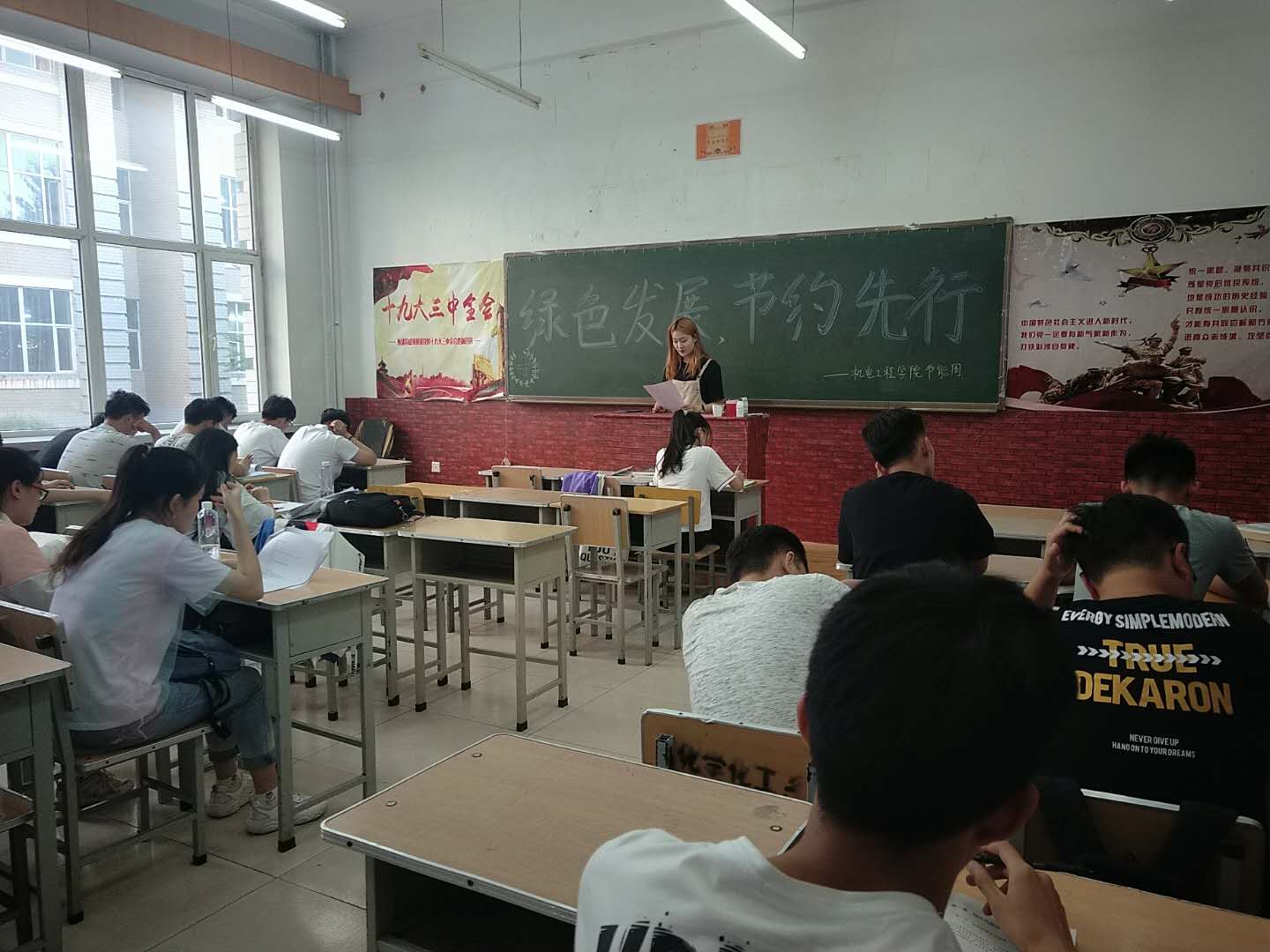 在全国节能周期间,通过宣传板报、宣传条幅等多种形式号召师生加入节能行动中。班会中,各班负责人向同学们发起以实际行动推进节能型校园的行动号召。同学们纷纷对生活中浪费资源的现象及节能方法方式发表了自己的看法,并积极分享自己节能的小窍门。