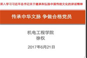 为贯彻落实习近平总书记“两学一做”精神内容,继承和传承中华民族传统美德。Beat365中文官方网站于2017年6月21日14:40综合楼306开展“传承中华文化,争做合格党员”党课教育活动。党课由徐权院长主讲,Beat365官网教工党员、学生党员参加。