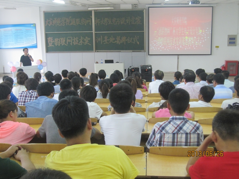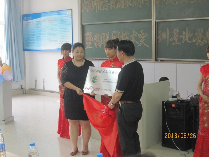 2013年6月26日下午14:00,物电学院在主楼1—3举行了“‘Beat365中文官方网站‘通联物网’杯大学生电子设计竞赛颁奖暨‘物联网技术实训基地’揭牌仪式”。此次活动由通联物网公司全程赞助,由物电学院学生党支部书记邓雨巍主持,物电学院院长徐权、党总支书记高玉芝、副院长刘开绪、刘永皓,通联物网郑智男总经理以及公司代表和学院全体老师参加了本次活动.