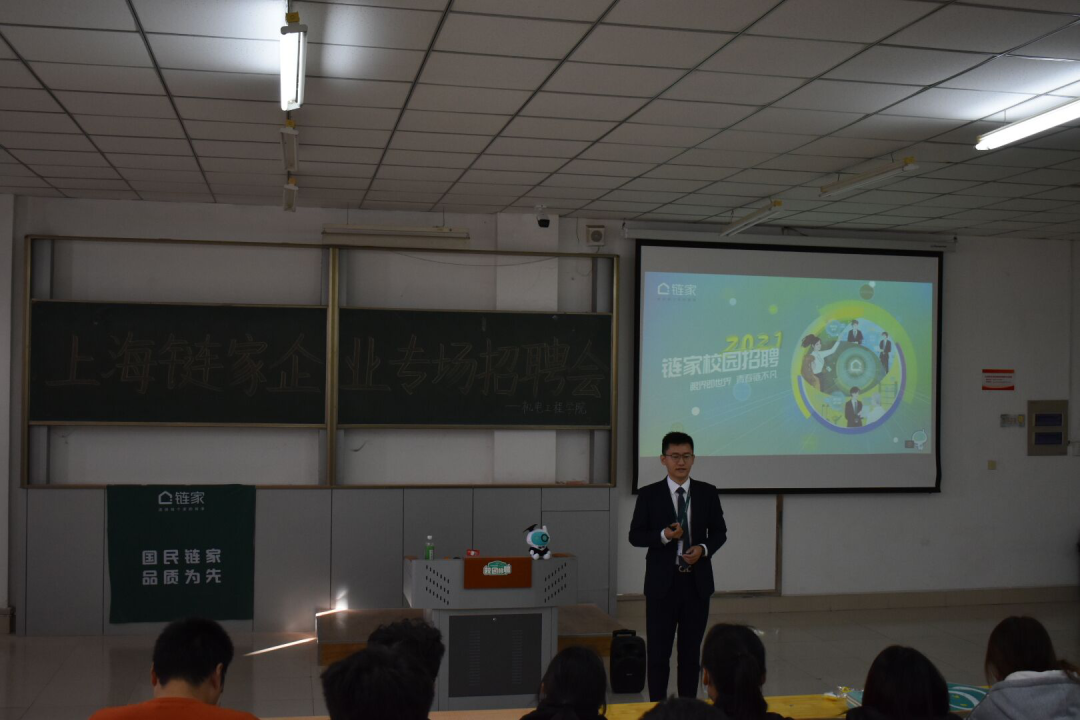 招聘会开始之时,企业有关人员播放企业宣传视频,随后主讲人以PPT的形式向在座的学生介绍了上海链家房地产经纪有限公司的实力。链家,是中国前沿的房地产服务企业,业务覆盖二手房、新房和租房等房产交易服务。目前已进驻北京、上海、广州、深圳、天津、成都、南京、大连等近29座城市,门店数量超过8000家,置业顾问超过11万名。