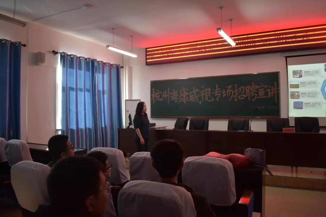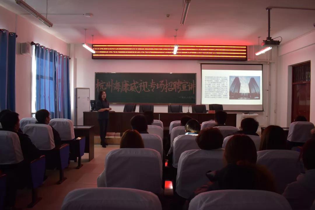 在招聘会上杭州海康威视的招聘教师介绍了海康威视的企业基本概况、发展前景与目标,阐述了他们对相关专业人才的要求以及企业需要招聘人才真诚的态度。