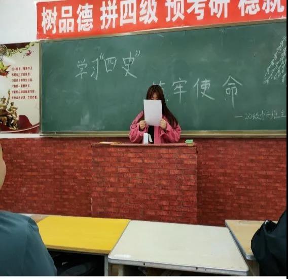 通过本次班会,同学们明白了“四史”学习是一趟浸润历史,凝新聚力的旅程,要以“书山有路勤为径,学海无涯苦作舟”的勇气决心把“四史”学懂学透,把汲取到的历史赋予、文化沉淀、民族精神力量转化为初心使命,成为开拓进取的勇气和力量,奋斗征程新时代。