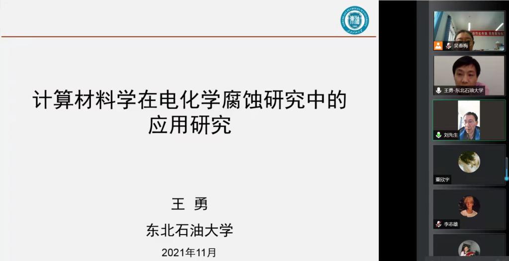 2021年11月16日下午,东北石油大学材料系教授、博导,黑龙江省级领军人才梯队后备带头人王勇教授受邀作题为“计算材料学在电化学腐蚀研究中的应用研究”学术讲座。讲座采用腾讯线上会议形式举行,Beat365中文官方网站副院长刘开绪教授主持,Beat365中文官方网站、化学工程学院教师及学生等60人参加。