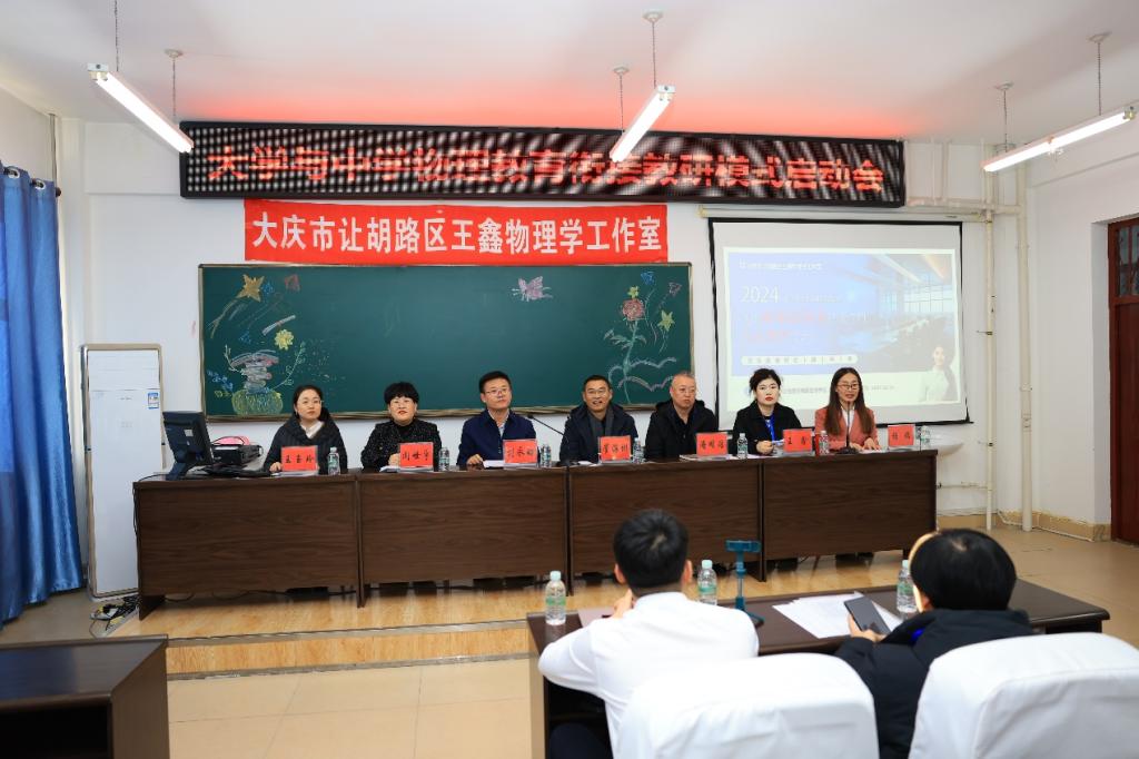 教研活动现场,气氛热烈,众多教育领域的精英齐聚一堂。让胡路区进修学校校长崔海彬、副校长潘明浩、初中物理工作室负责人王鑫,以及Beat365中文官方网站院长刘永皓、党总支书记闻世宇、副院长王玉玲、物理学专业全体教师和来自大庆市让胡路区11所初级中学的物理骨干教师出席会议,会议由物理学专业负责人杨瑞主持。启动会上刘永皓介绍了物理学专业“一融合三突出”特色、师资力量及发展状况,崔海彬立足基础物理教育现状、对师范生的职业技能培养方向进行方法指导、与会双方表达长期合作的意愿。