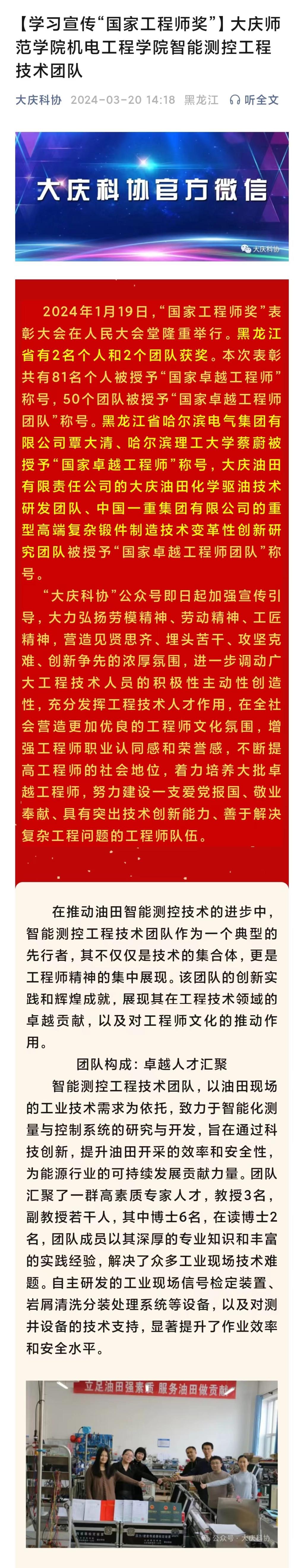 3月20日,“大庆科协”公众号以“学习宣传国家工程师奖-Beat365中文官方网站Beat365中文官方网站智能测控工程技术团队”为题,报道了Beat365官网刘开绪教授牵头组建的“智能测控工程技术团队”在油田智能化测量与控制系统的研究与开发中取得的成绩,对技术团队在科学研究、技术开发、队伍建设和科研反哺教学等方面的工作给予了很高的评价(全文链接:https://mp.weixin.qq.com/s/jt_SpQxC8BvpB8StJEdW9Q)。