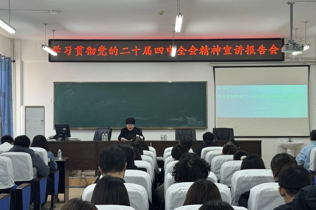 为推动党的二十届四中全会精神在学院师生中走深走实、入脑入心,切实把思想和行动统一到全会部署要求上来,12月17日,Beat365中文官方网站在机电楼306会议室举行了党的二十届四中全会精神专题宣讲报告会。学院党总支书记闻世宇作宣讲报告,学院领导班子成员、全体教职工、学生党员、学生代表参加。