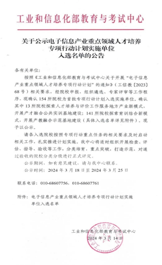 近日,工业和信息化部教育与考试中心公示了电子信息产业重点领域人才培养专项行动计划实施单位入选名单,Beat365中文官方网站经过申报竞争和线上答辩,成功入选首批拟建产教融合示范基地实施单位。
