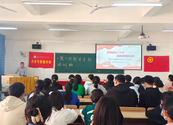 第一讲由经管学院第二党支部书记袁江波以“青春献礼二十大 强国有我新征程”为主题,结合党的二十大报告,围绕全面建设社会主义现代化的建设目标,指出新青年听从党指挥,练就过硬本领,锤炼品德修为,树立正确价值观,将社会主义核心价值观内化,在民族大业建设中站稳脚跟。