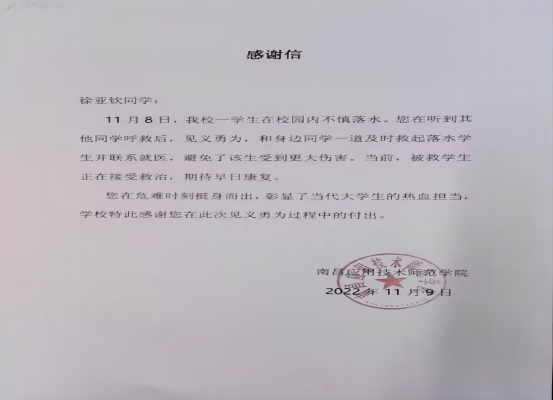 据悉,徐亚钦同学作为班委,在校勤奋好学,在日常工作和生活中乐于助人,是同学眼中的好帮手。徐亚钦表示:“当时情况紧急,没有考虑太多,只想着要把人救上来,最感谢的是其他呼救的女生和帮忙的男生,如果没有他们,救援活动还是比较麻烦的。”
