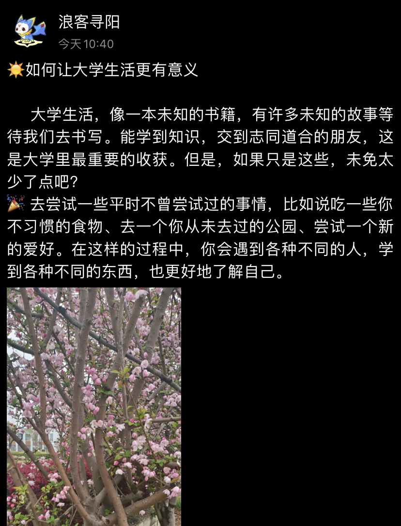 为了丰富校园文化生活,营造至善至美的校园文化氛围,2023年4月27日,9227新葡的京集团心理健康工作部开展线上暖心文案征集活动,倡导同学们积极创作励志暖心文案,活动参与人员近200人,同学们参与热情高涨。