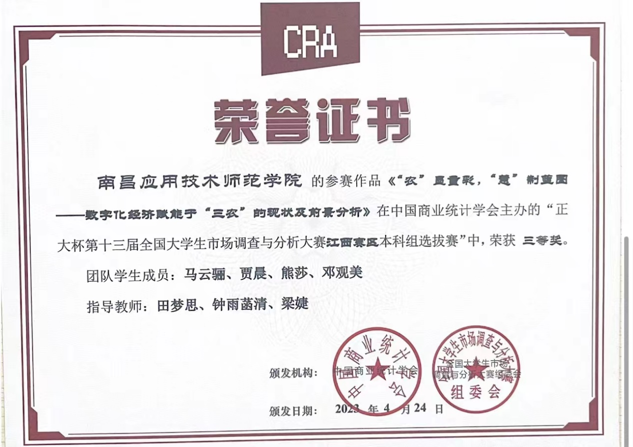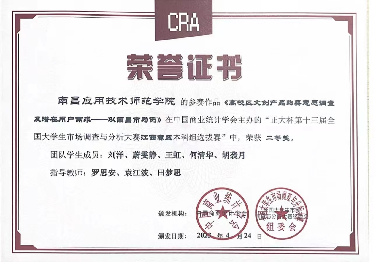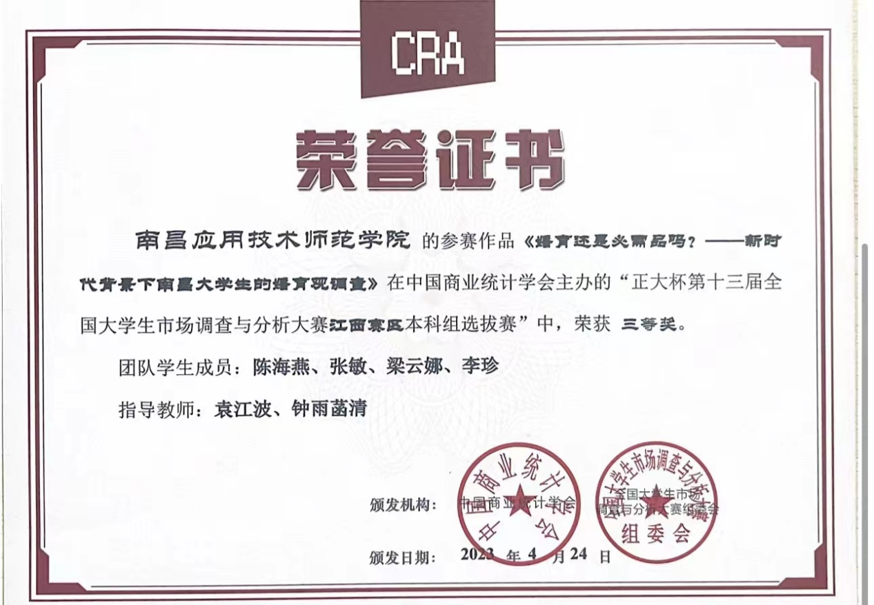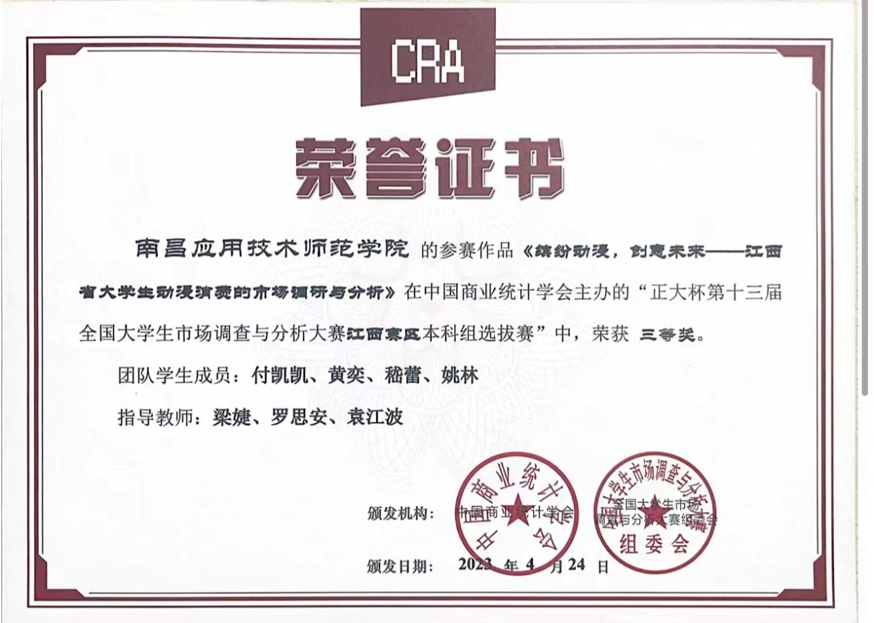 近日,由中国商业统计学会主办的“正大杯第十三届全国大学生市场调查与分析大赛”,江西赛区本科组已公布比赛结果,我校9227新葡的京集团罗思安、袁江波、田梦思、梁婕和钟雨菡清老师指导的学生参赛作品获得比赛二等奖1项,三等奖3项。