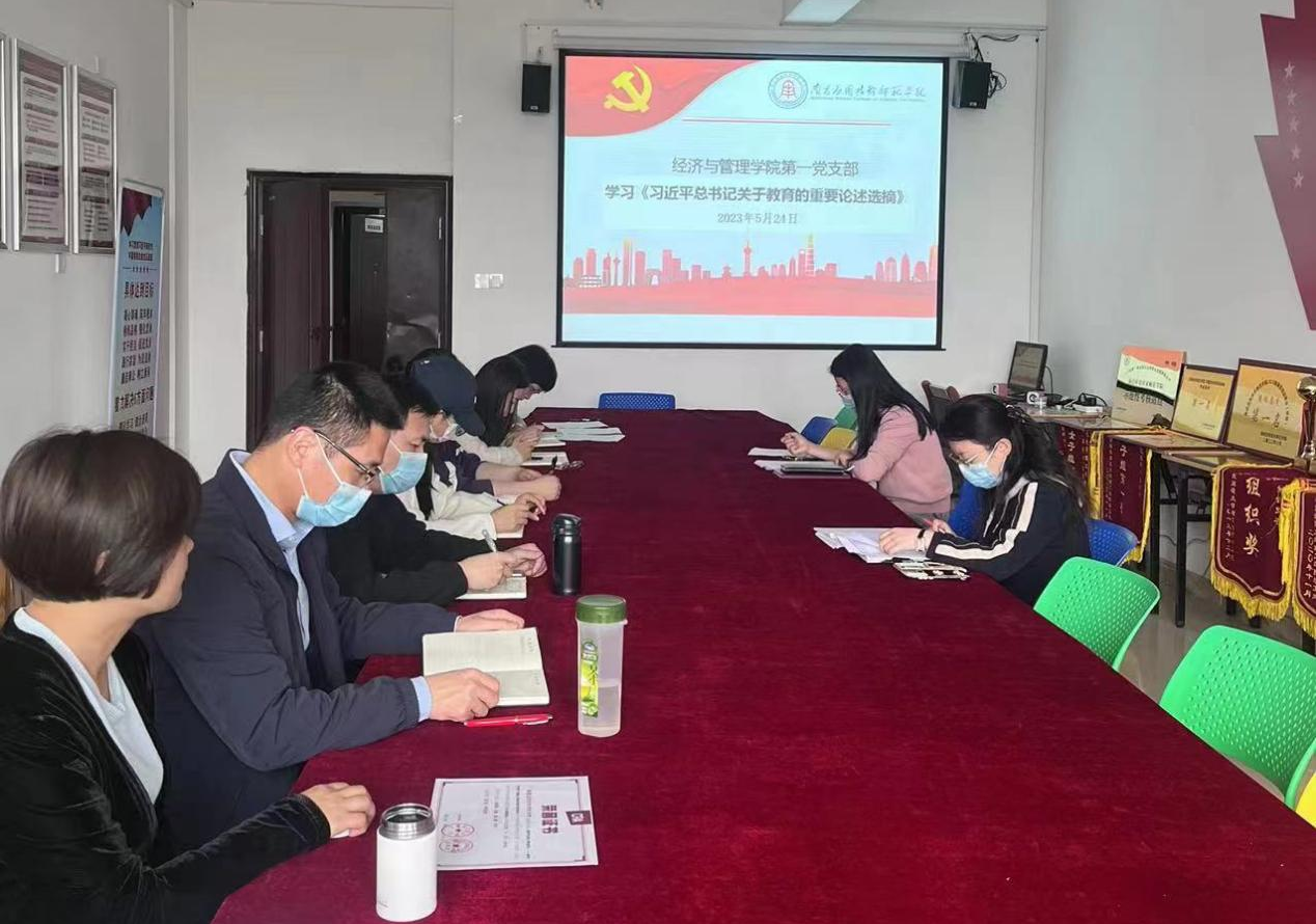 深入学习贯彻习近平新时代中国特色社会主义思想主题教育,按照学校党委的工作部署和学院主题教育的工作安排,牢牢把握“学思想、强党性、重实践、建新功”总要求,把高质量开展好主题教育作为一项重大政治任务,坚持高标准、严要求,紧扣目标任务、精心谋划组织、全面动员部署,推进主题教育走深、走实。2023年5月24日下午,9227新葡的京集团第一党支部在1207会议室召开5月主题党日活动,集体学习《习近平总书记关于教育的重要论述选摘》中第一部分“习近平论教育”的内容,会议由第一党支部书记刘慧玲同志主持,全体党员教师参加集体学习并交流研讨。