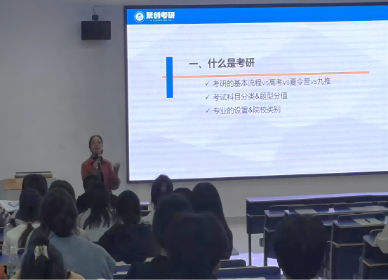 接着,在刘老师耐心的答疑中,同学们对考研方向有了更加明确和深刻的思考。生动的案例、直观的讲述、趣味的互动,刘老师鼓励大家要结合自身情况,树立并明确目标,以认真的态度去达到目标。“长空万里砺鹏翅,瀚海千帆竞远舟。”刘老师以悉心和幽默风趣的方式提高了同学们的考研热情,明确了同学们攀“研”之路的方向,增进了同学们考研的信心。