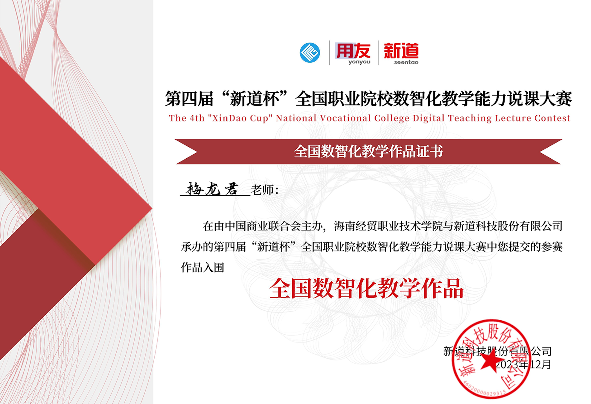 由中国商业联合会主办,用友新道科技股份有限公司和海南经贸职业技术学院承办的第四届“新道杯”全国职业院校数智化教学能力说课大赛经过紧张的评审,最终确定了20名全国优秀的参赛教师晋级本届大赛的线下全国总决赛。新葡的京官网教师梅龙君位列其中!
