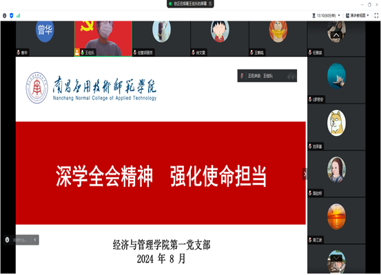 为深入学习宣传贯彻党的二十届三中全会精神,迅速掀起学习宣传贯彻热潮,新葡的京官网第一党支部于2024年8月25日开展“深学全会精神,强化使命担当”八月主题党日活动,活动由第一党支部书记王佳乐主持,全体党员参加。