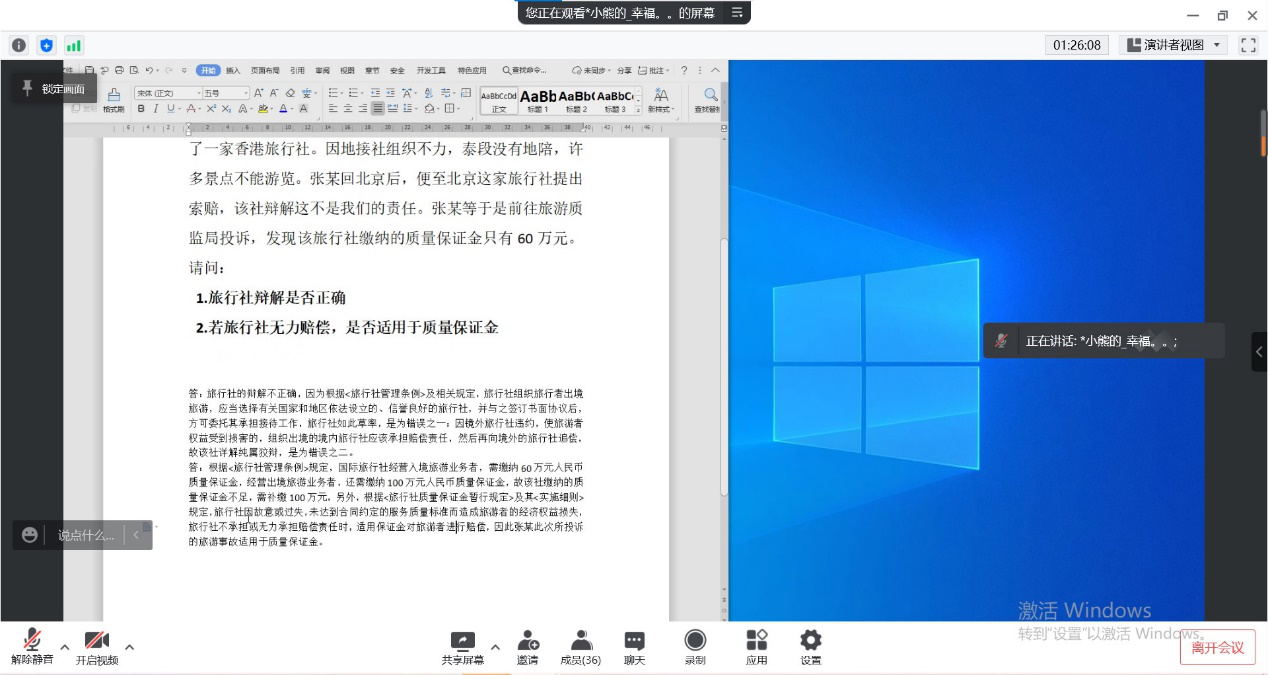 2022年3月16号上午,9227新葡的京集团的熊桃慧老师给我们带来了一堂轻松愉快的线上旅游法规课程。在上课开始前,熊老师积极备课并提前熟悉线上教学软件;在上课期间,她目标明确地带我们回顾了上节课的内容;逻辑清晰地将课程中的理论知识与实际经验相结合。同时在课程中提出问题,以增加课堂的互动性。我们也紧跟老师的思维,积极回答老师的提问。在疫情期间,虽然我们无法面对面的交流和锻炼,但老师仍心系学生,多次嘱咐我们要加强锻炼和注意身体健康。